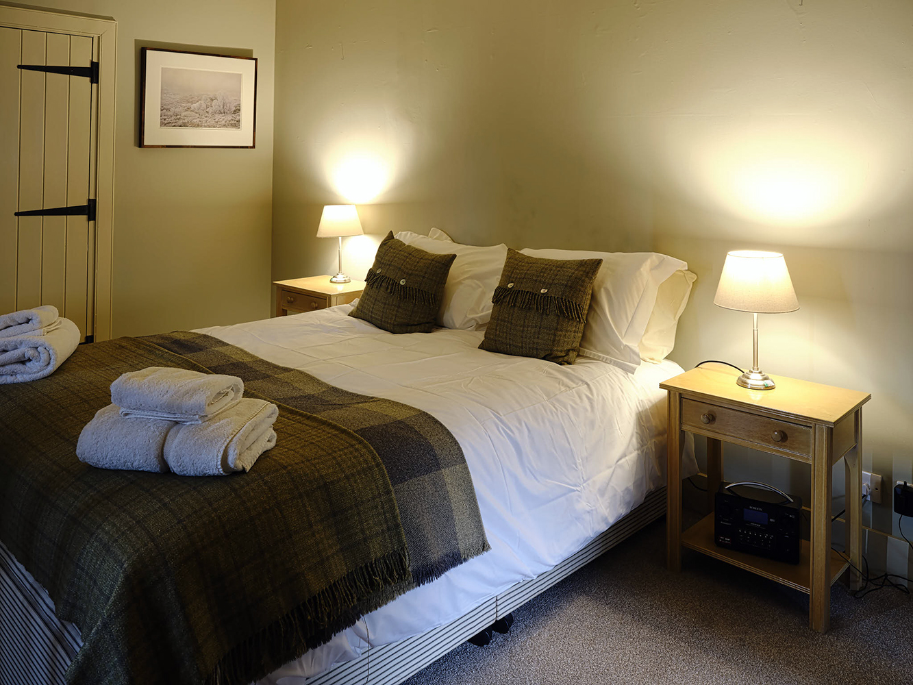 The house is sheltered by trees on three sides and stands in a huge fenced grass garden, with lovely open views to the front across the river to the heather covered moors and hills which surround the property. There are also two kennels outside where dogs can be left if guests want to go out without them.
